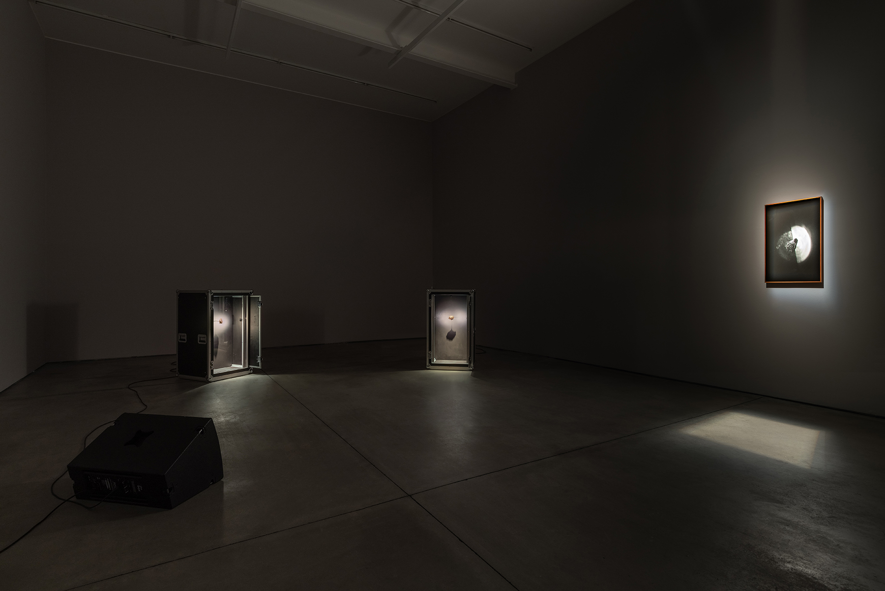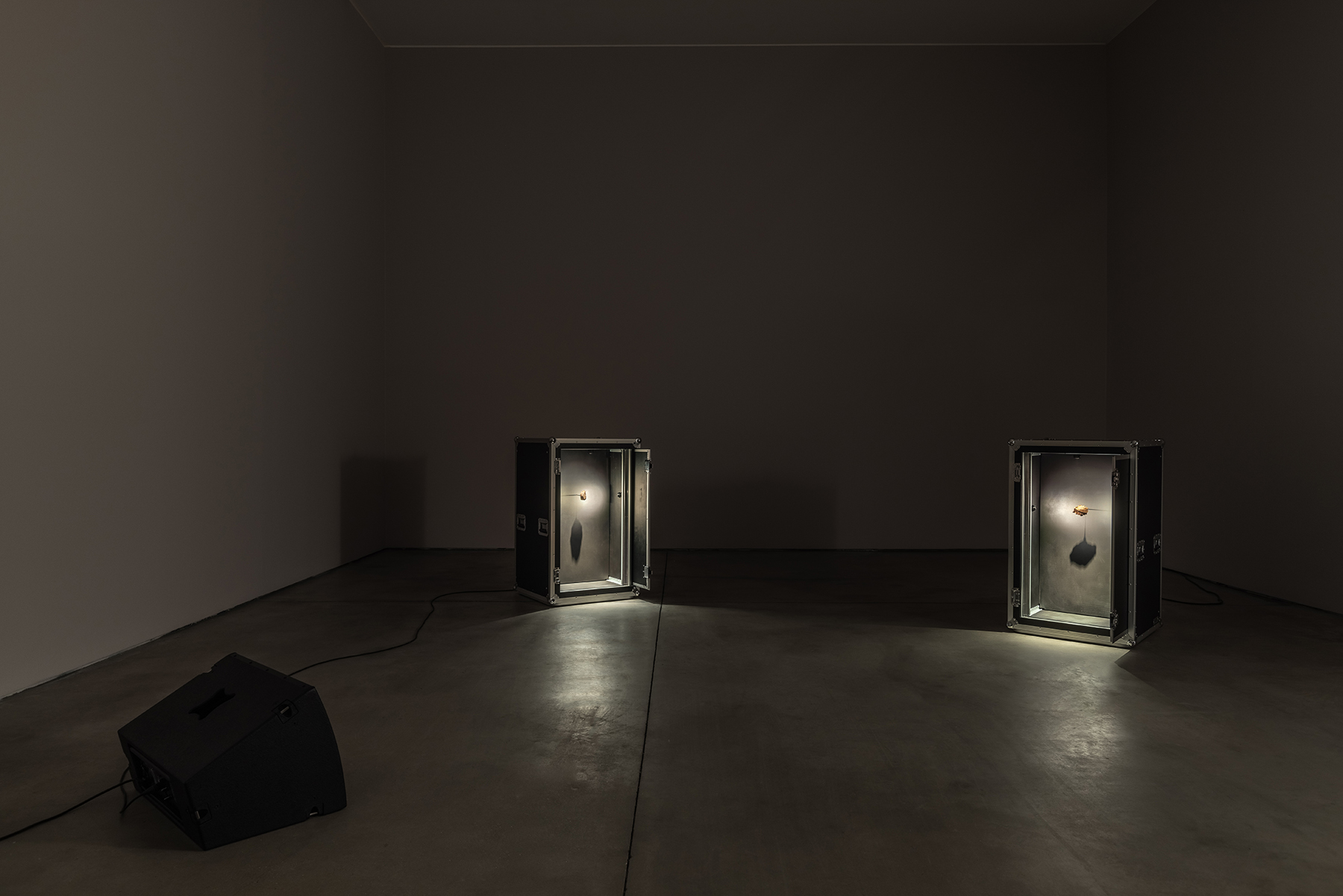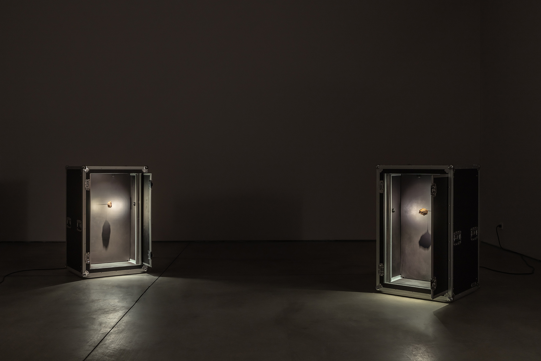 Cerrados em caixas de transporte aéreo de outros equipamentos musicais para concertos, aqui modificadas para a vitrines darem lugar, os meteoritos esperam a sua viagem enquanto próprios instrumentos monolíticos desta sinfonia de desvelamento e reza. Fantasmas da sua própria origem e artefactos da sua condição, aguardam vagarosamente por um caminho nunca iniciado, exímio e resumido à repetição da audição do desfortúnio que, para chamarem a vida, os apagou — parece fazer sentido, agora, como um crítico descreveu o som de um theremin como um violoncelo perdido num denso nevoeiro, a chorar porque não sabe como voltar para casa [9]. O som, também em loop, da melodia principal, é-lhes frontalmente direcionado por uma coluna de palco cujo propósito factual é devolver aos músicos o som que emanam em concerto, uma vez mais reiterando a circularidade formal do dispositivo e do propósito de destruição/devolução cósmica presente na exposição — reforçando uma espécie de elogio fúnebre em perpétuo movimento.