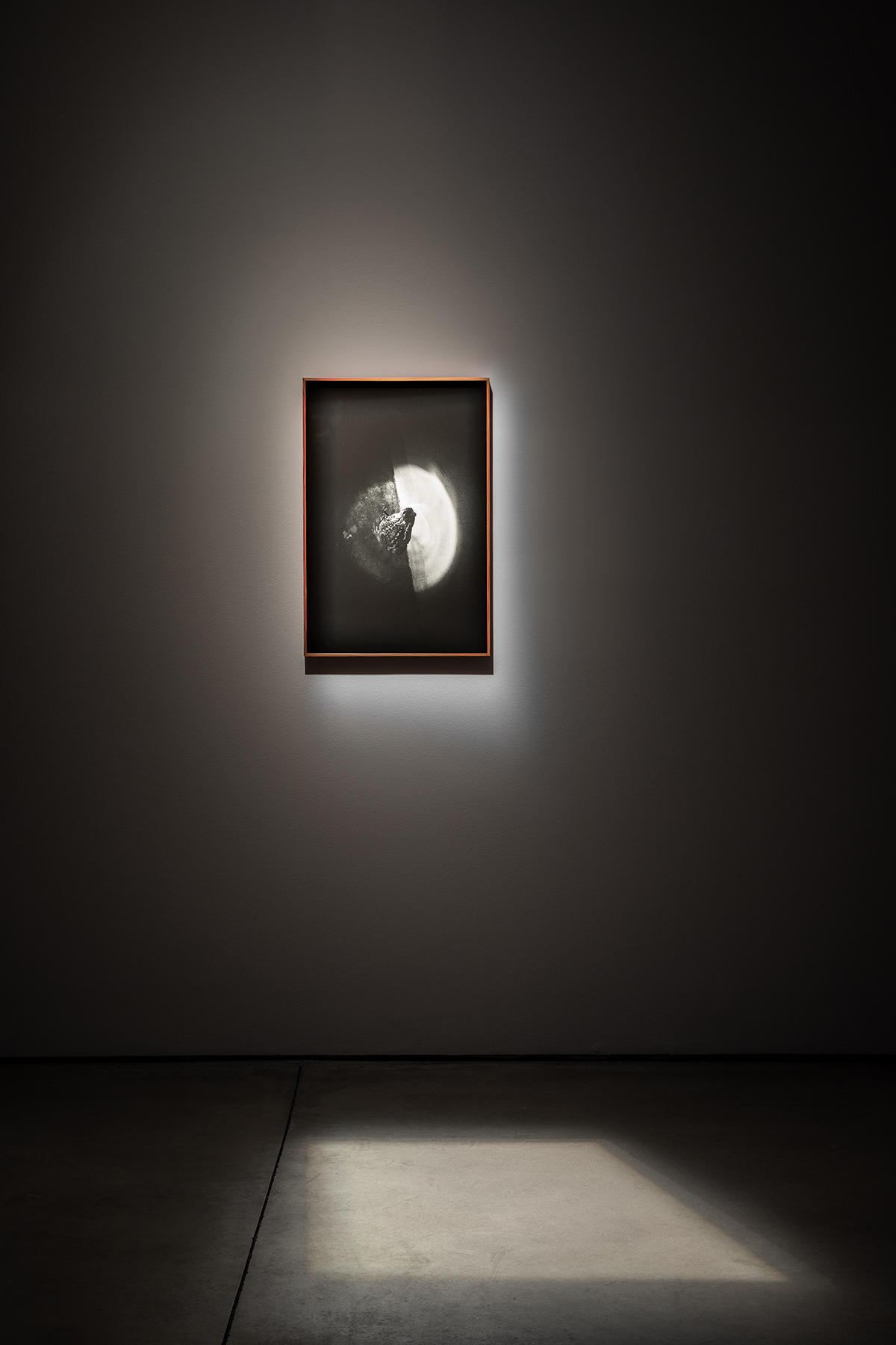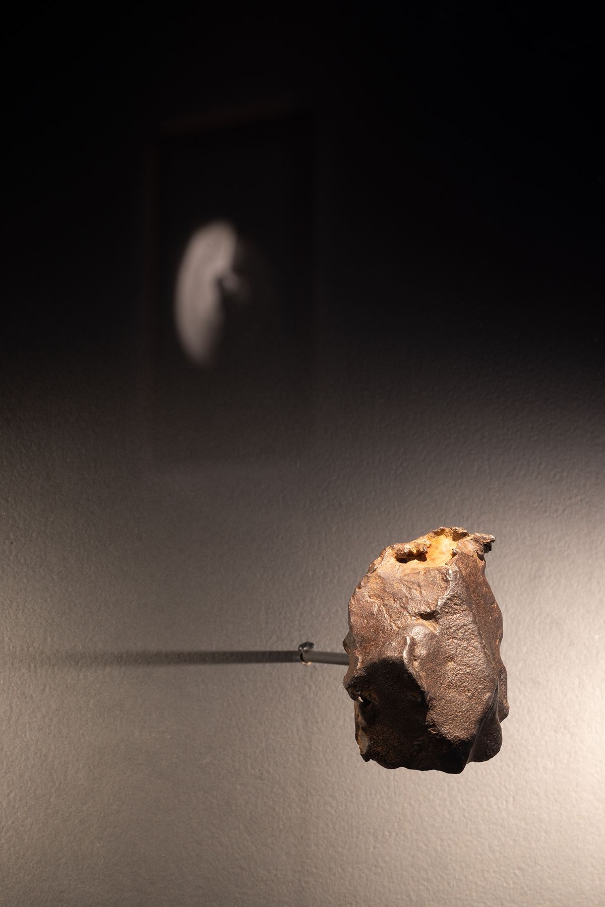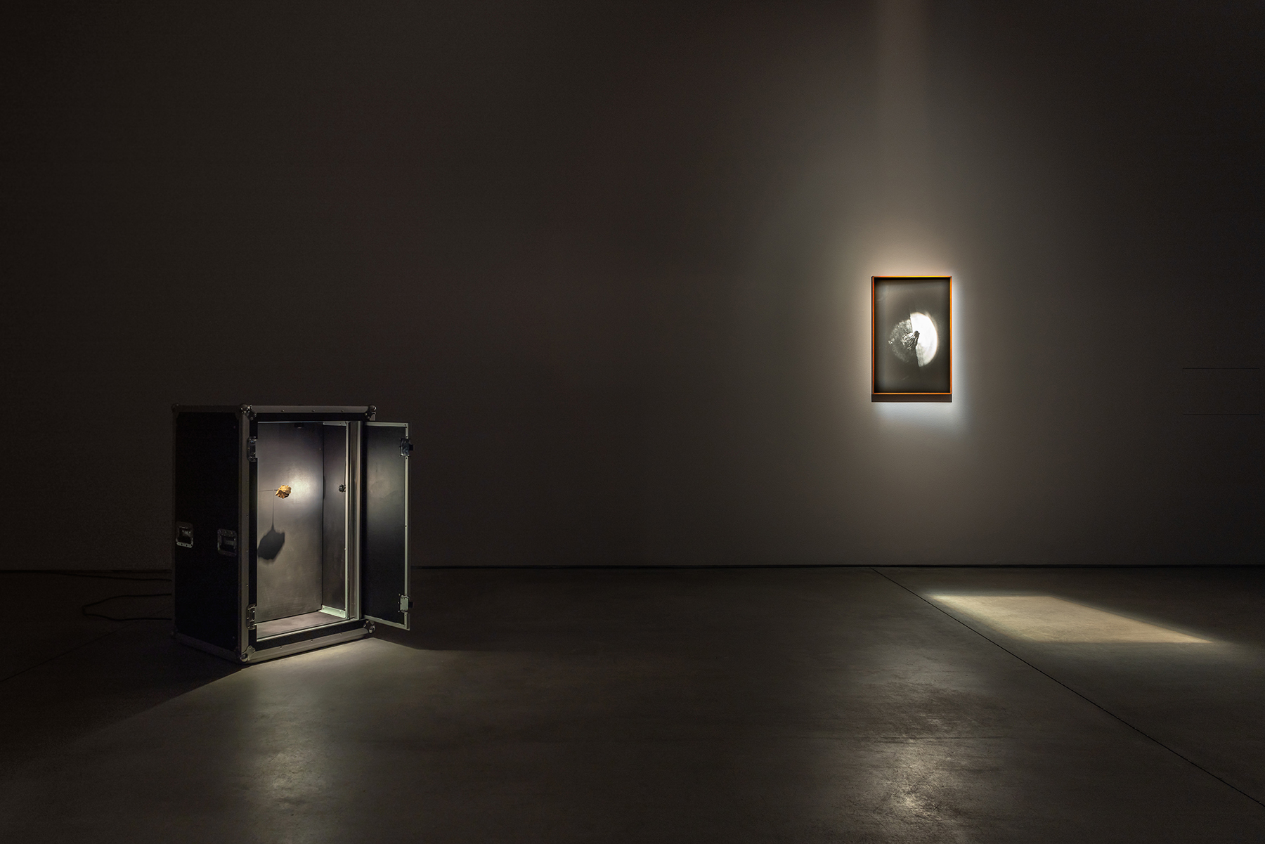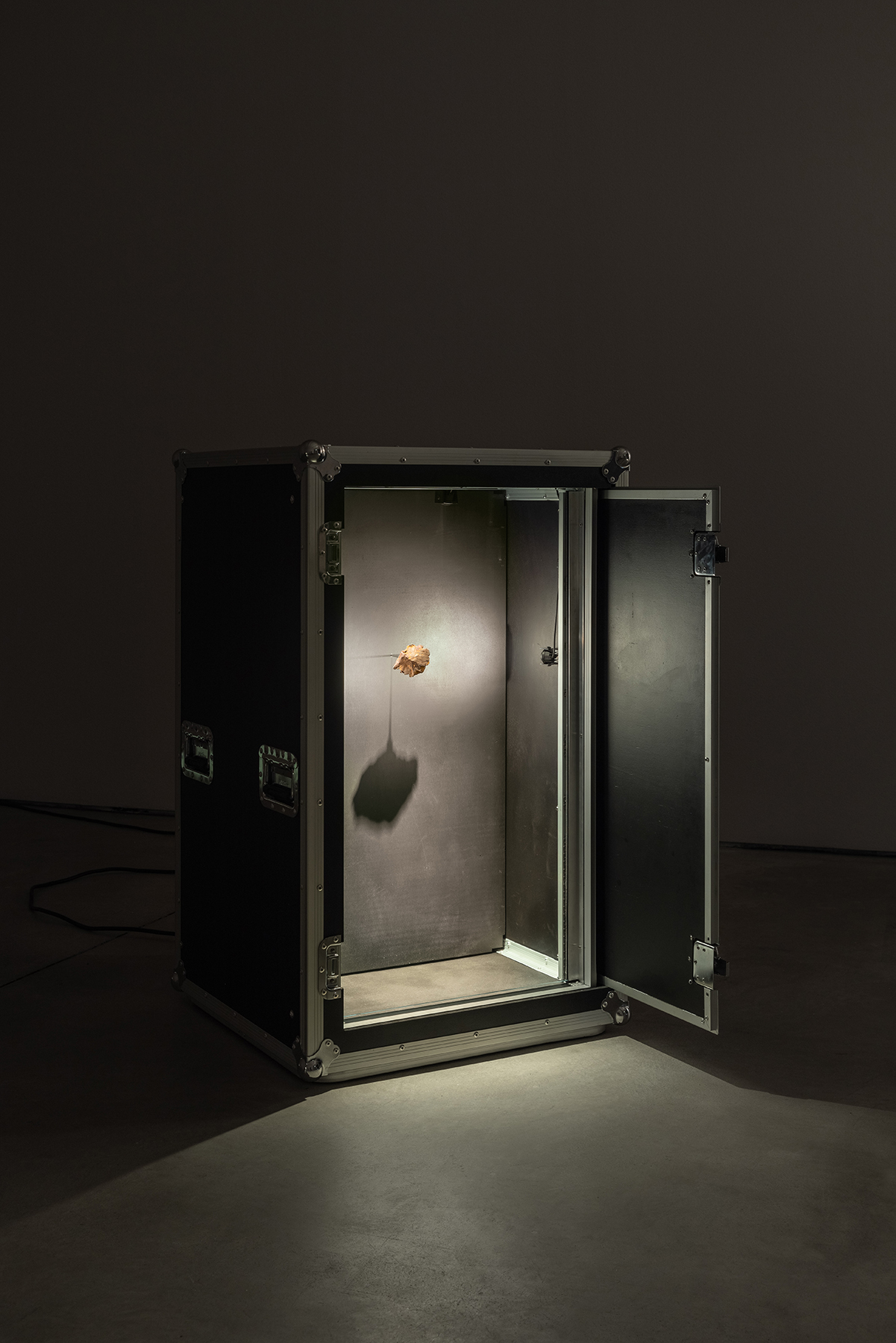 Cerrados em caixas de transporte aéreo de outros equipamentos musicais para concertos, aqui modificadas para a vitrines darem lugar, os meteoritos esperam a sua viagem enquanto próprios instrumentos monolíticos desta sinfonia de desvelamento e reza. Fantasmas da sua própria origem e artefactos da sua condição, aguardam vagarosamente por um caminho nunca iniciado, exímio e resumido à repetição da audição do desfortúnio que, para chamarem a vida, os apagou — parece fazer sentido, agora, como um crítico descreveu o som de um theremin como um violoncelo perdido num denso nevoeiro, a chorar porque não sabe como voltar para casa [9]. O som, também em loop, da melodia principal, é-lhes frontalmente direcionado por uma coluna de palco cujo propósito factual é devolver aos músicos o som que emanam em concerto, uma vez mais reiterando a circularidade formal do dispositivo e do propósito de destruição/devolução cósmica presente na exposição — reforçando uma espécie de elogio fúnebre em perpétuo movimento.