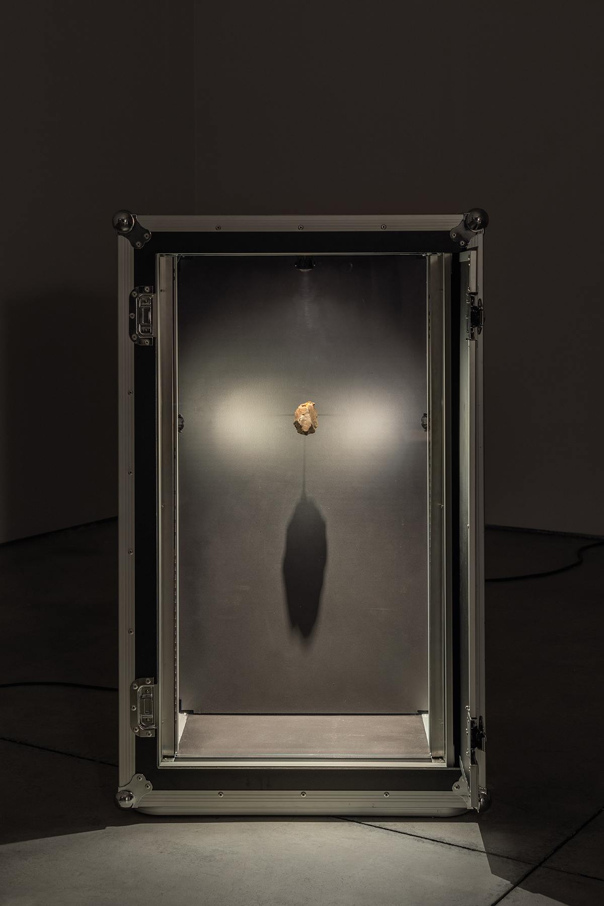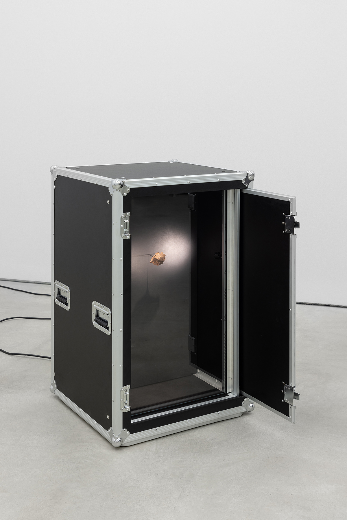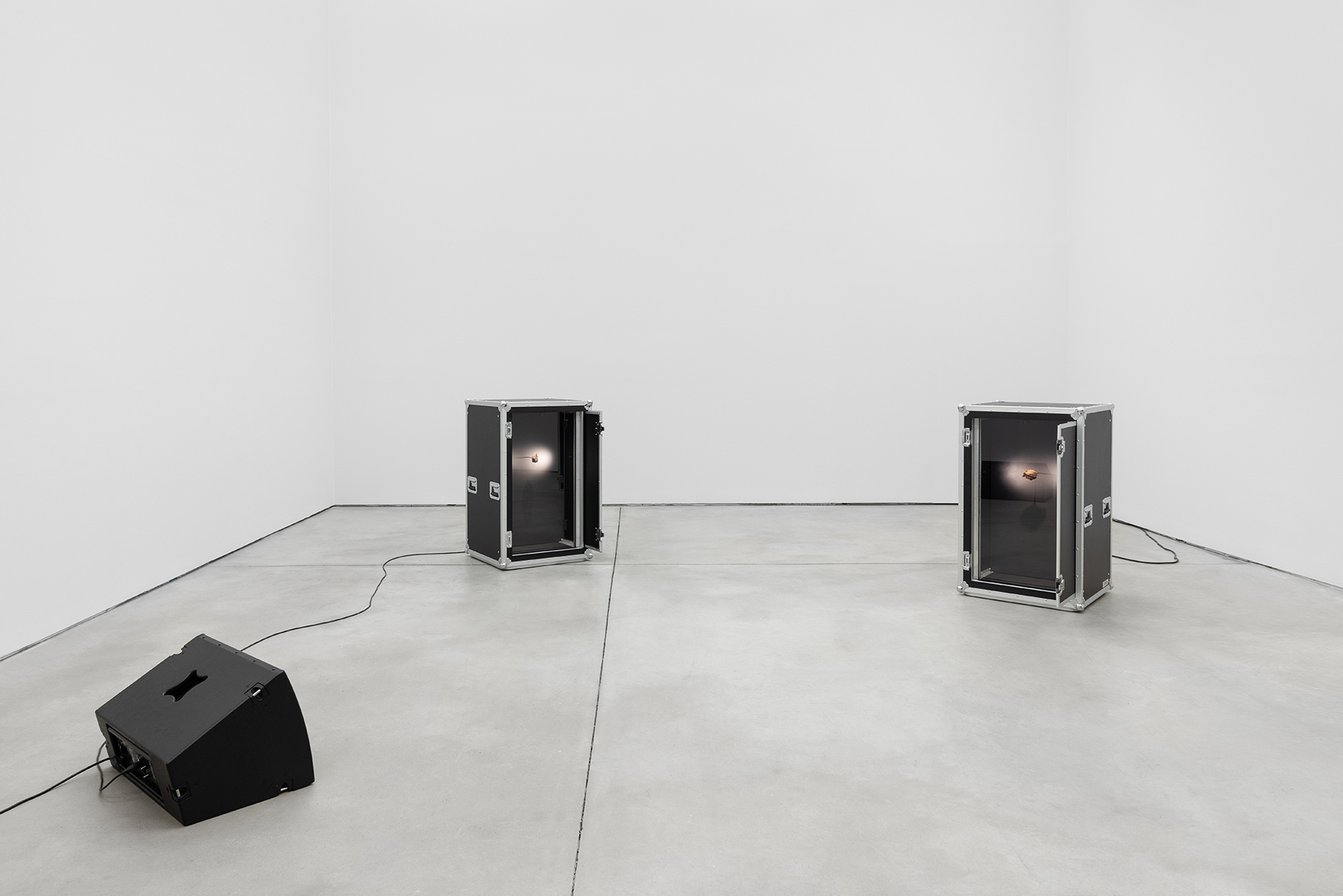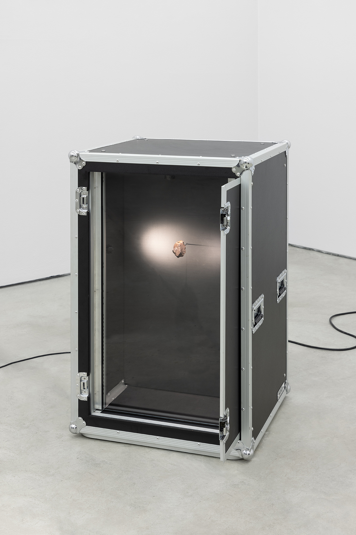 Meteorito de ferro Gebel Kamil (proveniência: Al Wadi al Jadid, Egipto, 2009 (276,07gr) – IMCA#2093 – GMA #0052, meteorito de ferro Gebel Kamil (proveniência: Al Wadi al Jadid, Egipto, 2009 (341,27gr) – IMCA #2093 – GMA #0052, (2x) Flyht Pro Rack 20U Slide Shock (modificado), (2x) placas magnéticas, monitor de palco 800W, som (“Summertime” de George Gershwin tocado em Theremin com meteoritos de ferro (um para cada mão), loop contínuo)